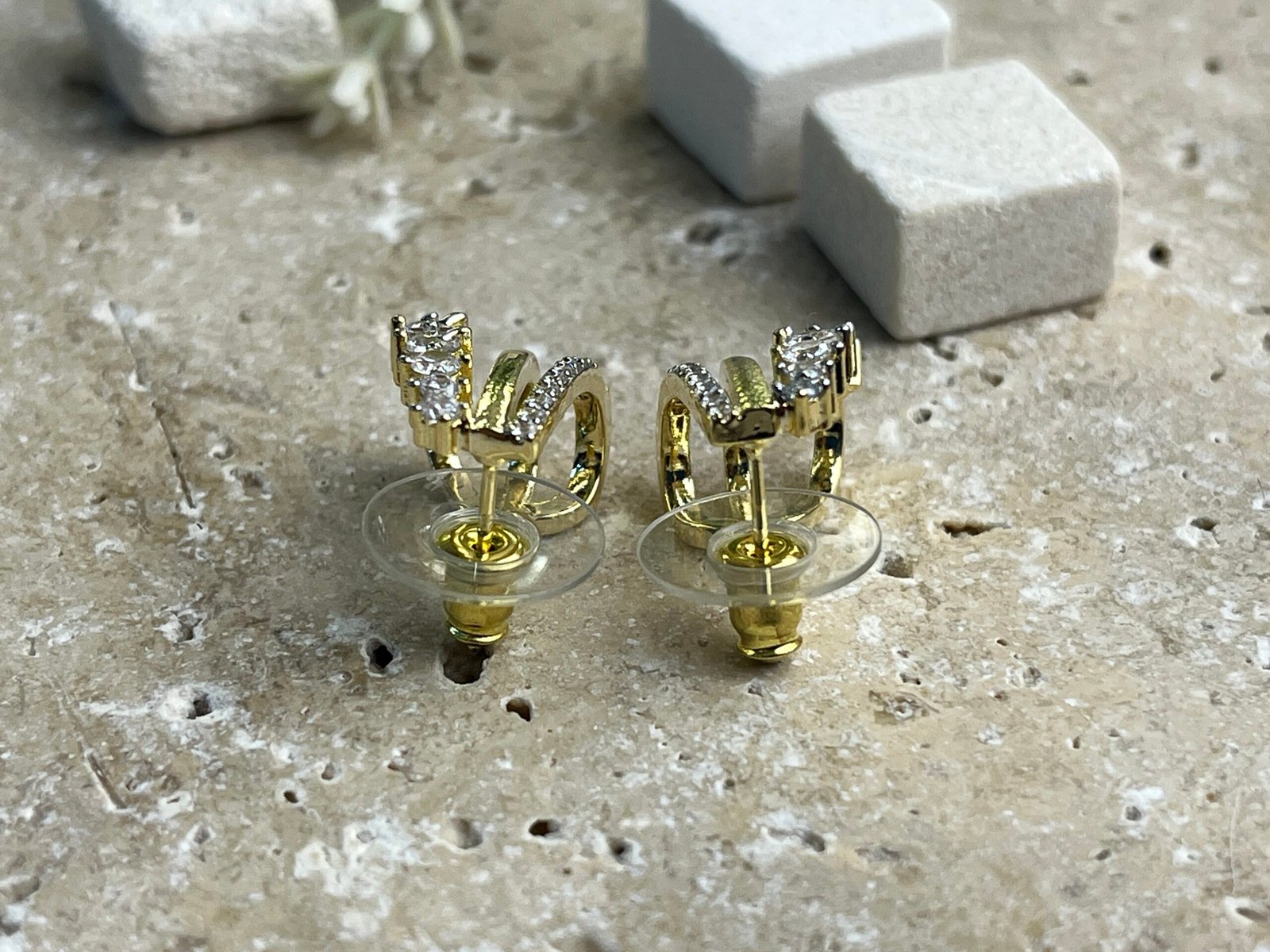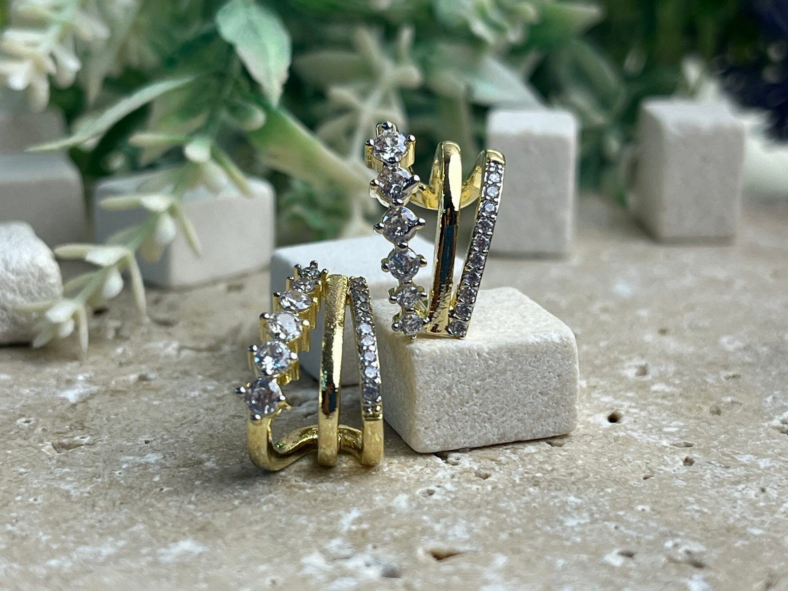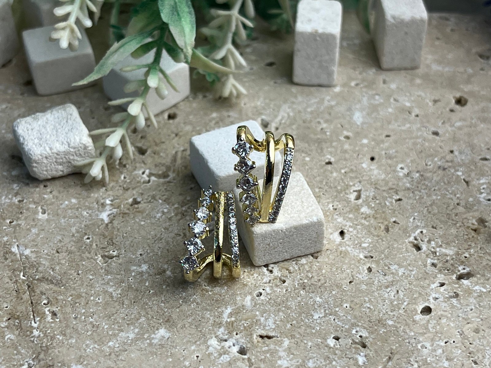 Caliyanis’ten zarif altın detaylarla süslenmiş bu halka küpeler, ışıltılı taşlarıyla göz kamaştırıyor.