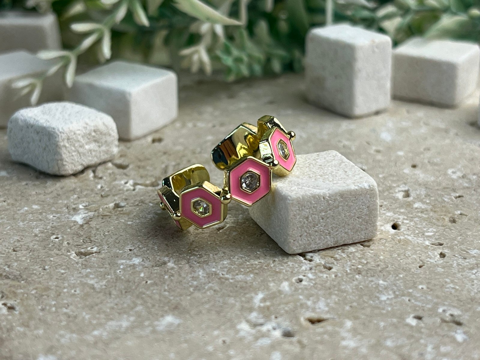Caliyanis’ten altıgen formdaki pembe detaylar ve ortasındaki zarif taşlar, bal peteğinden ilham alan modern ve enerjik bir görünüm sunar.