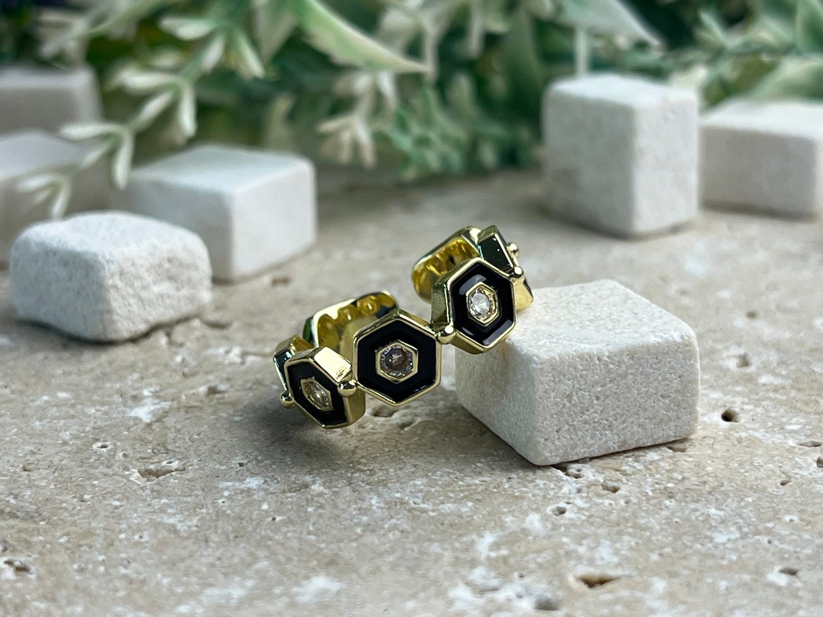 Caliyanis’ten altıgen formdaki siyah detaylar ve ortasındaki zarif taşlar, bal peteğinden ilham alan modern ve enerjik bir görünüm sunar.