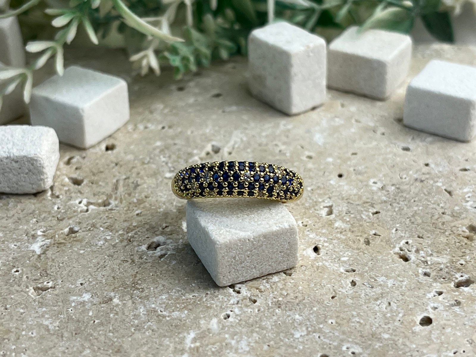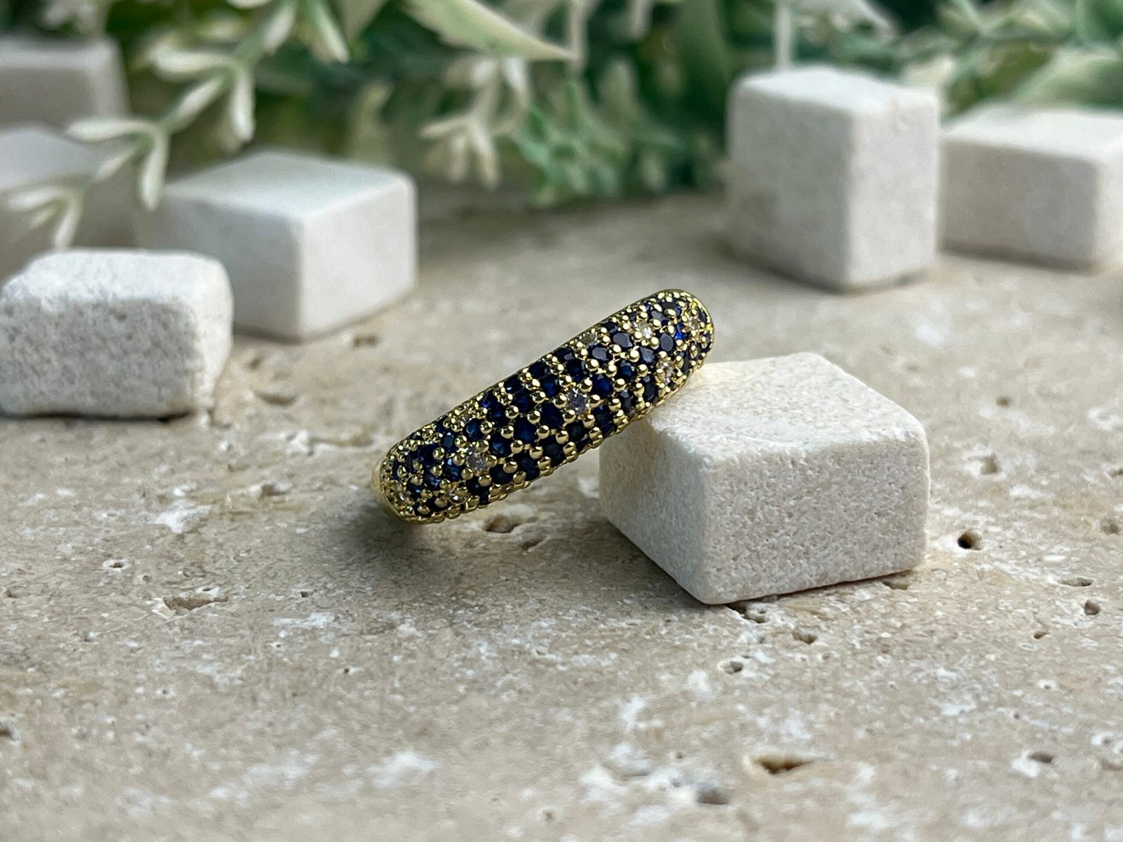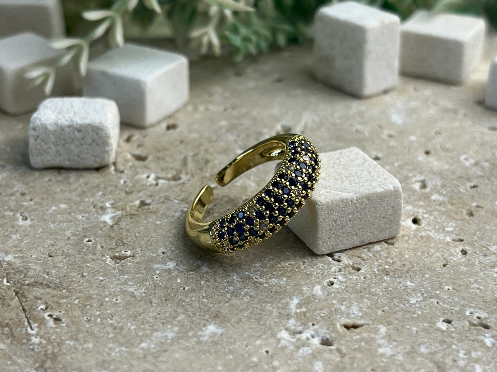 Altın zemin üzerine yerleştirilmiş koyu lacivert taşlar, güçlü ve sofistike bir stilin tamamlayıcısıdır. ( CYRG0015 ) kodlu ürünümüze Caliyanis sayfamızdan ulaşabilirsiniz.