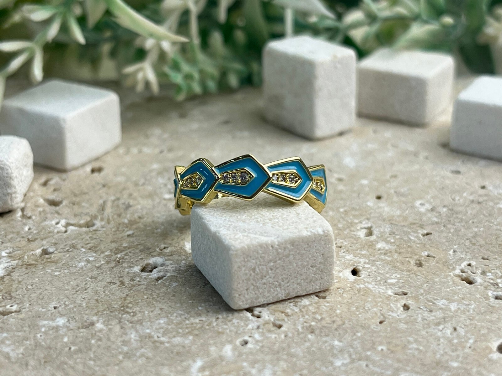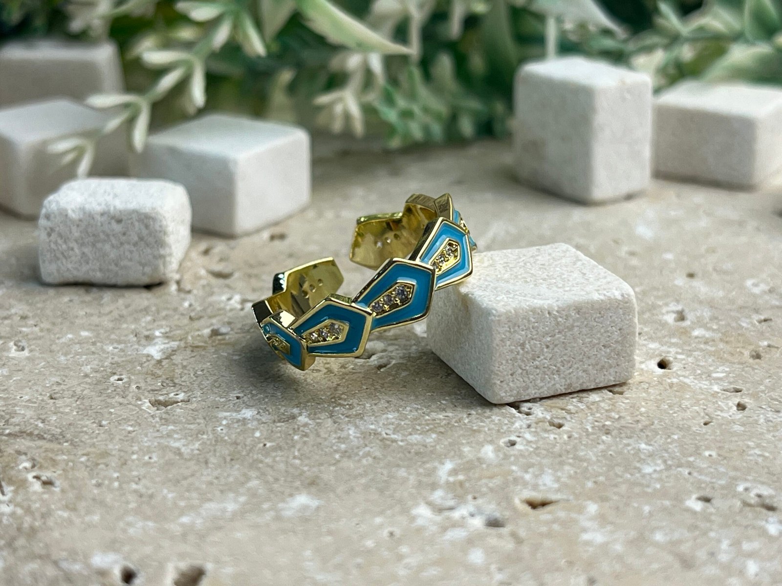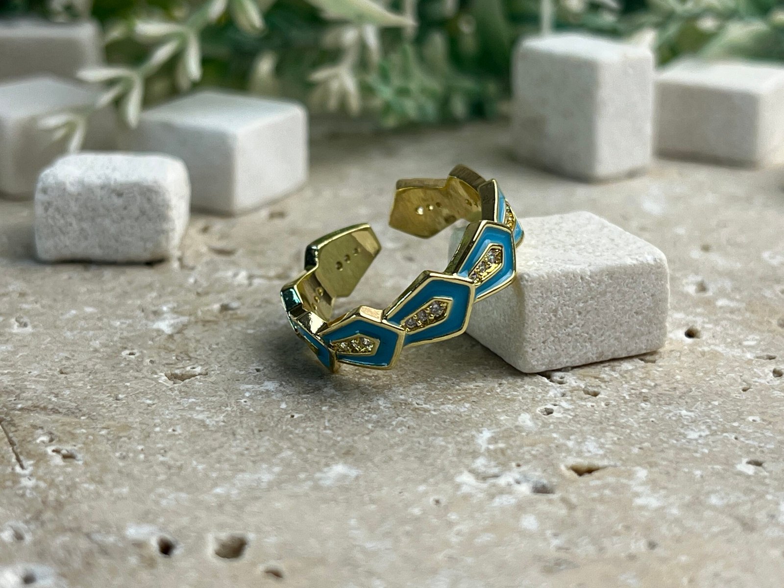 Caliyanis’ten geometrik formda dizilmiş Mavi detaylar, yüzüğe modern ve enerjik bir karakter kazandırıyor.