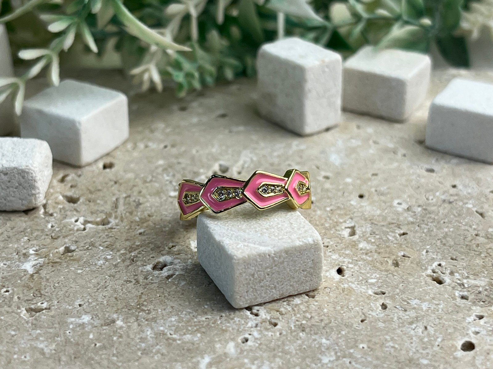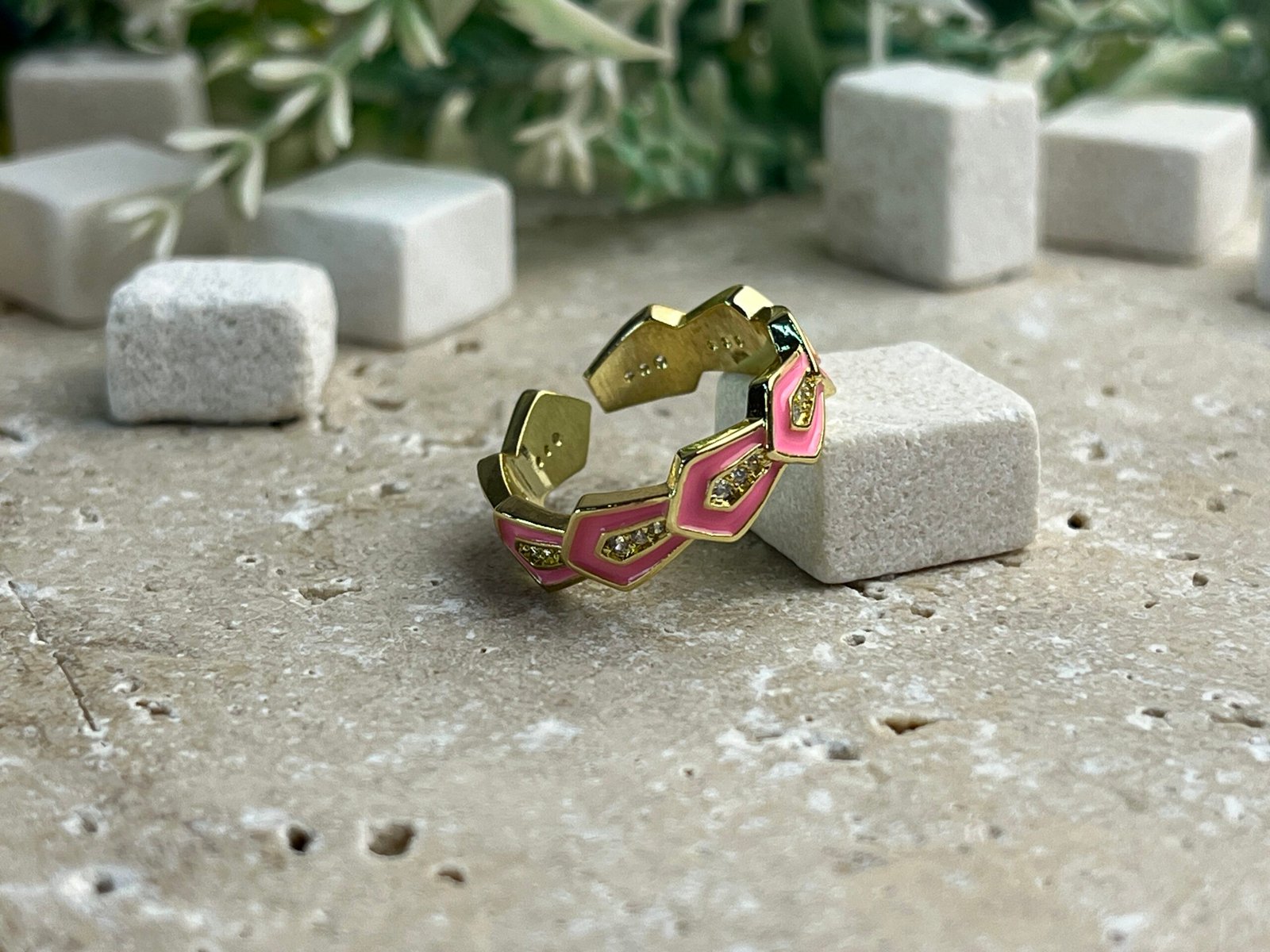 Caliyanis’ten geometrik formda dizilmiş pembe detaylar, yüzüğe modern ve enerjik bir karakter kazandırıyor.